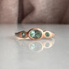 A lovely green tourmaline ring with a lovely minty Paraiba colored Tourmaline. Emerald accents flank each side of this three stone ring. Hand-sculpted and cast in 14K Rose Gold. Hammered texture on the band. So so lovely